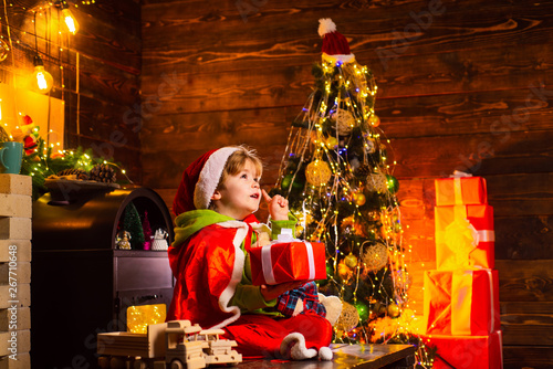 Believe In Christmas Miracle Wish To Meet Santa Claus Winter Holidays Happy Childhood Merry Christmas And Happy New Year Adorable Child Play At Home Dreamy Baby Toddler On Christmas Eve Stock Photo